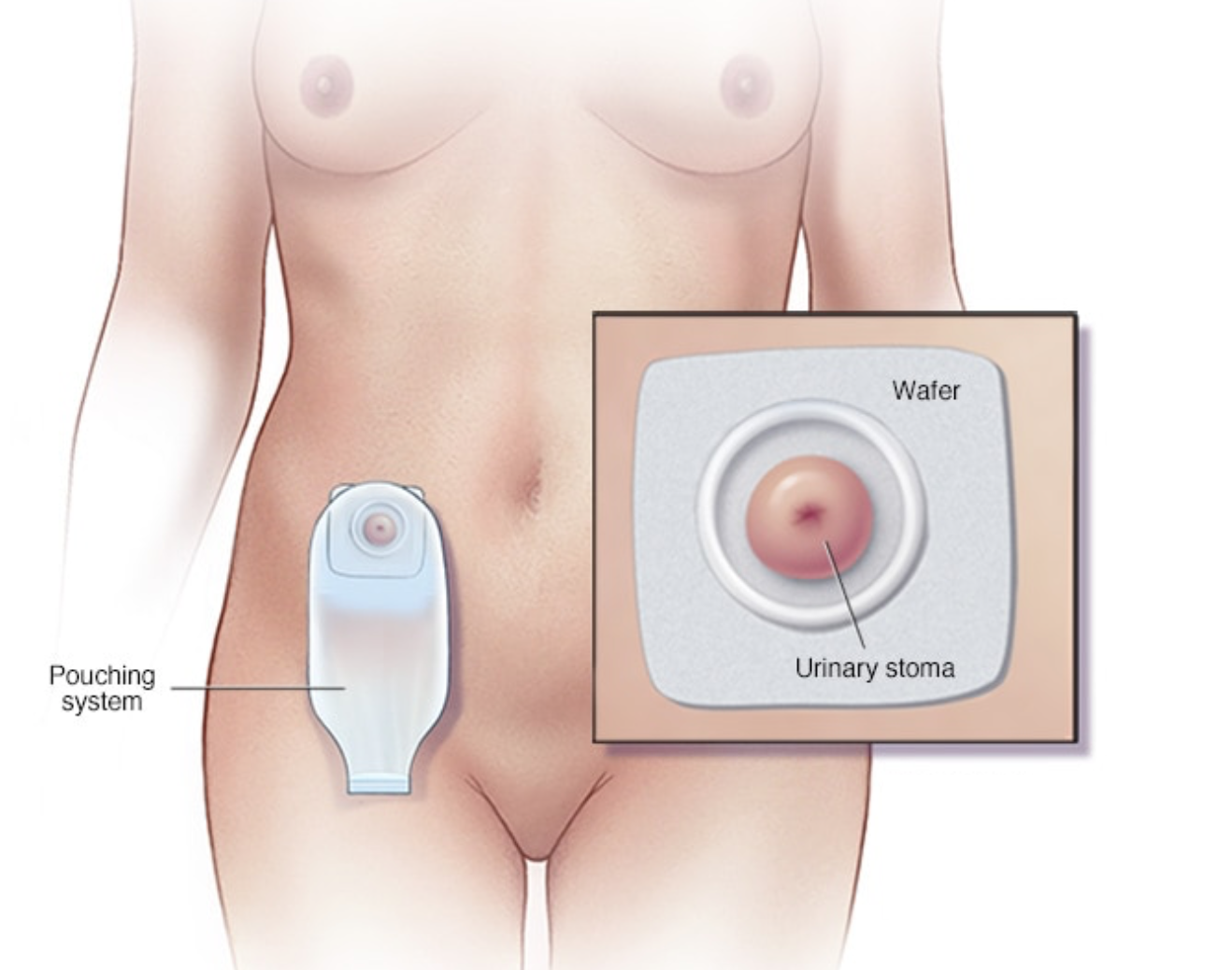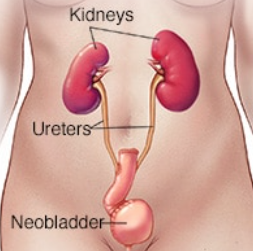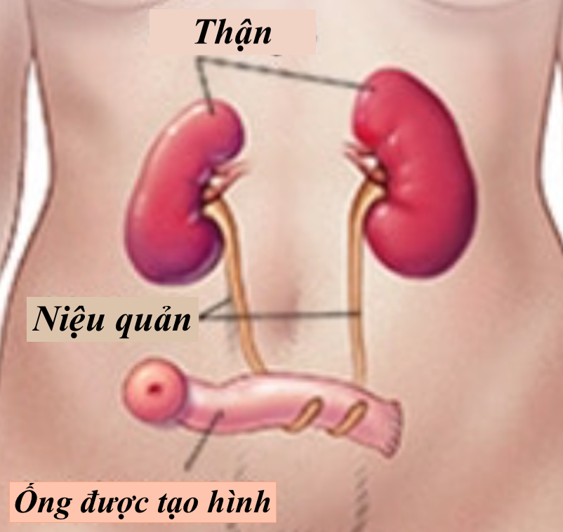2.-Ống dẫn nước tiểu : Cắt bàng quang tận gốc nạo hạch  sử dụng một đoạn ruột non  để tạo ra một ống . niệu quản được cắm vào nối thận với một lỗ mở trong thành bụng (stoma). Nước tiểu chảy ra từ lỗ mở liên tục vào một chiếc túi bạn đeo trên bụng dính vào da và lấy nước tiểu khi đầy có van xã ra