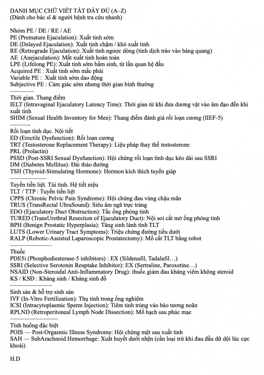 Mỗi ca đại diện một “kiểu bệnh” thường gặp trong phòng khám: từ xuất tinh sớm bẩm sinh, PE mắc phải, DE do thủ dâm, RE do thuốc, đến các trường hợp hiếm như POIS, tắc ống phóng tinh, hay mất xuất tinh sau RPLND.