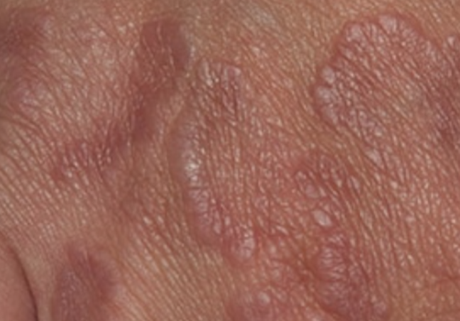 2. bắt đầu như nốt đỏ, lan rộng mạnh vào vết loét của các cạnh cuộn, giống như hạt cần sinh thiết ở cạnh vết loét
