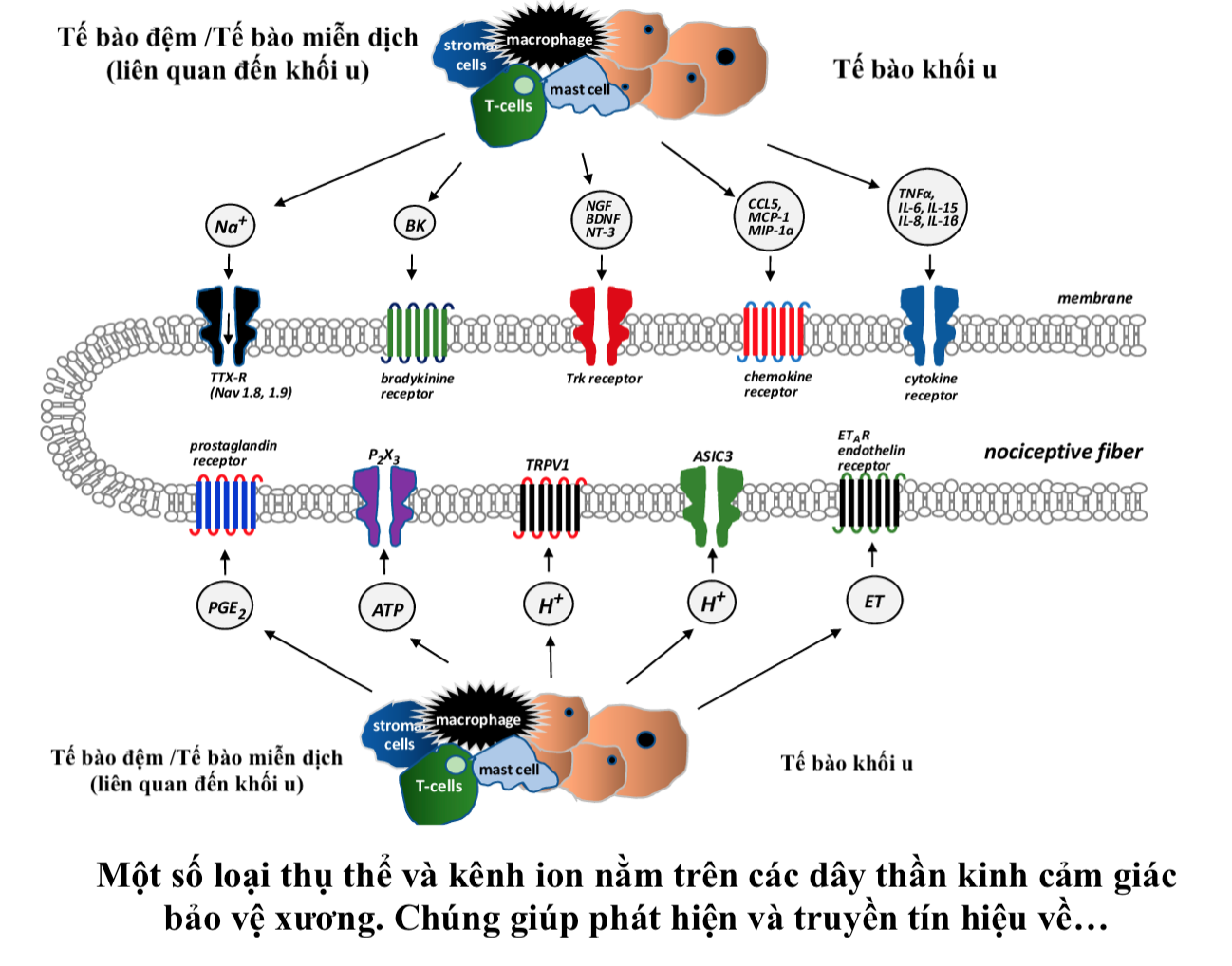Sự di căn của ung thư tuyến tiền liệt đến xương làm rối loạn sự cân bằng bình thường giữa tế bào hủy xương và nguyên bào xương trong quá trình tái tạo xương khỏe mạnh. Hình thành các tổn thương hoại tử xương bao gồm xương kém chất lượng dễ bị gãy. Ngoài ra, các sợi thần kinh cảm giác hướng tâm chính bên trong màng xương và tủy xương của xương bị ung thư xâm lấn trải qua quá trình nảy mầm bệnh lý. Sau đó, những sợi này được nhạy cảm bởi một loạt các chất trung gian cảm thụ tiền có trong mô viêm của xương bị ung thư xâm lấn. Những chất trung gian này tương tác với các cơ quan thụ cảm và kênh ion chung của chúng để truyền tín hiệu cảm thụ tinh thần vào sừng lưng của tủy sống và từ đó đến các trung tâm cao hơn trong não, nơi nó có thể được hiểu là cảm giác đau.